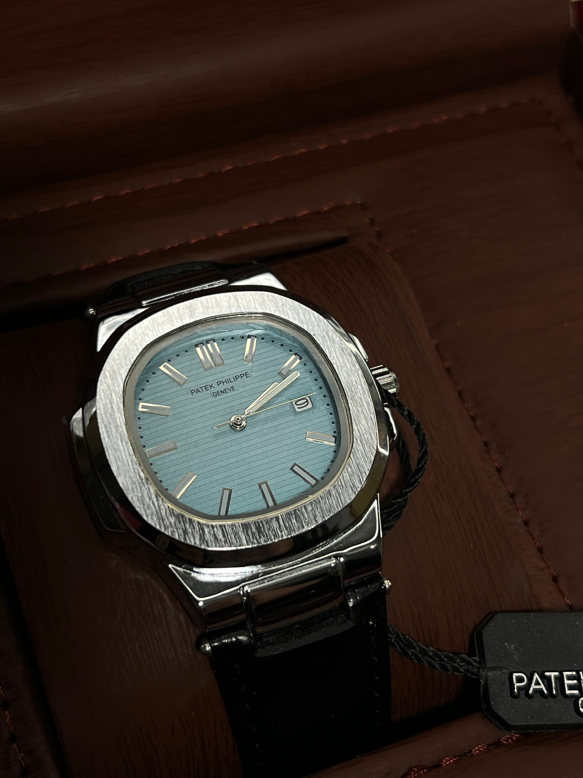 Patek Philippe Geneve Black Leather Strap Watch – Silver Case & Tiffany Blue Dial